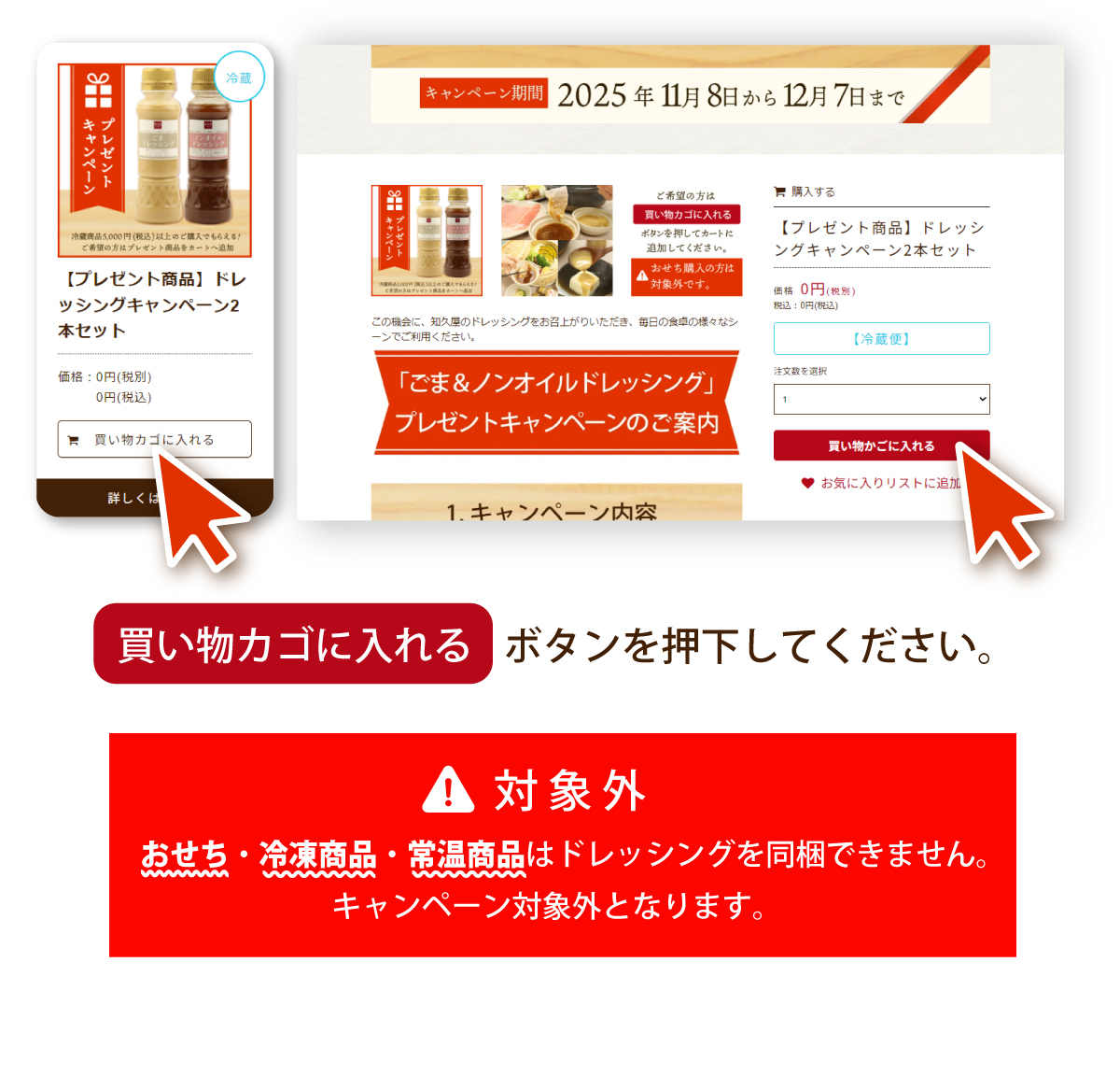期間中、知久屋オンラインストアで、冷蔵商品を含む合計金額5,000円(税込)以上ご購入いただいき、プレゼント品をカートへ追加されたお客様に、「ごまドレッシング」・「ノンオイルドレッシング」を各1本ずつ プレゼントいたします!